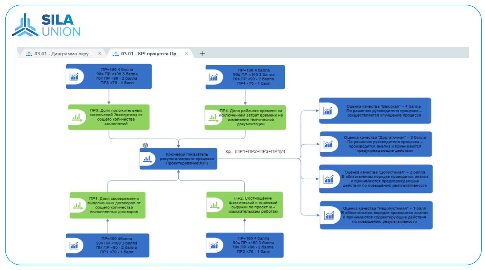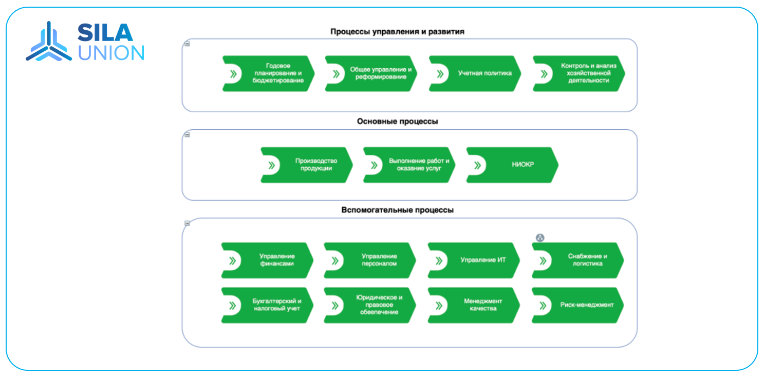 Для представления организации как объекта управления со взаимосвязанными процессами и осуществления полного цикла управления требованиями к продукции в единой цифровой среде используется платформа SILA Union. В SILA Union проектируется бизнес-архитектура компании, на базе которой разрабатывается и подготавливается к сертификации система управления в соответствии с требованиями стандартов ISO.